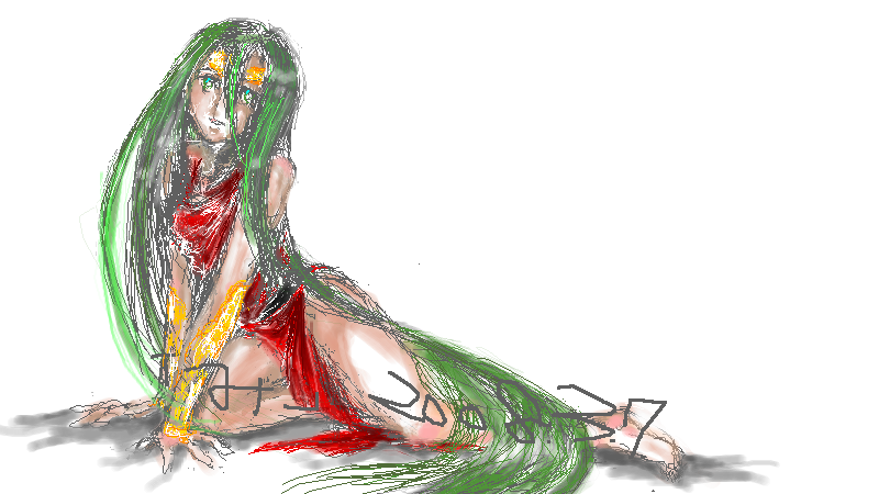 色っぽいポーズと衣装なのに、上半身だけ見ると清純さと神秘性を感じさせる、不思議なキャラ、不思議な絵ですね。