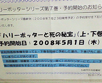 早速図書館に行ってハリー・ポッター最終巻の予約をしてきました。 今日が予約開始日だったんですよ^^ きょうはすんごあったかいです 予想最高気温27℃ わお 図書館開館前に行って予約専用パソの前に並んでパソで予約完了♪ 惜しくも1ケタゲットならず・・・・・・・ だれだ、私の前に並ぶ32人! 同じ条件、同じ時間に予約したはずなのに!! このペースなら今年秋には読めるでしょう、多分。 私の前に並ぶ32人の皆様、まきを入れて読んでくださいませ ネタバレサイトでだいったい読んだようなもんですが、やっぱ愉しみ^^ でも購入する気にならないのは あまりにかさばる本だから