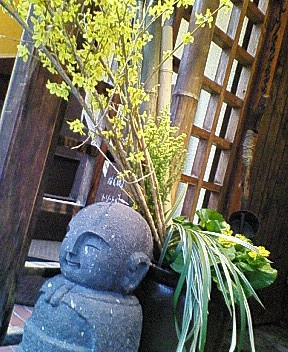 御地蔵様のお花は連翹とつわぶき