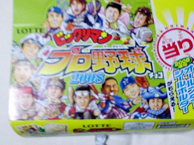 買い物に近所の西友によくいく。 ここで買い物をするたびにここで私が使ったお金の一部がG.G佐藤のお給金になっているんでしょうか と思いながら買い物して パック入りソーセージのシャウエッセンを手にとっては買い物籠に入れないその度ごとに 日ハムの選手にお金を落としていないなあ・・ ごめんよ、ひちょり、稲葉さん、ダル などと思い込みつつ買い物をしていたのですが このたびこういうものを購入 ごーんと大人買い 「ロッテビックリマン プロ野球チョコ 2008」 全36種類 天使・悪魔・お守りのキャラわけは無いようです。あれば面白いのに。 ロッテの選手だからといって優遇されてシールになるなどという身贔屓もないようです ということは12球団あるから一球団につきキャラ3人・・・・・ 日ハムは一人はダルビッシュでしょう 一日二枚程度チョコウェハース食べつつ誰のシールが出るのか楽しみにしている こうして私は成瀬や里崎のお給料の一部のためにお金をおとしているわけですね |