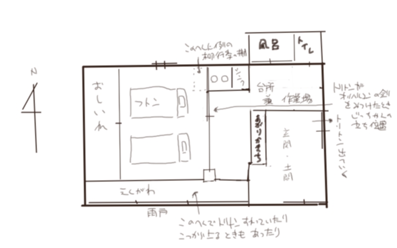 「名作マンガの間取り」 影山明仁著 ソフトバンククリエイティブ 現役の建築コンサルトさんが名作マンガの架空の間取りを図面に引いたその数、五十軒分。 こういうの、子供の頃から好きでした。 レゴで作ったり、図面を引いてみたり。 チャットでトリトンの家の間取りってどんなんでしょうねーって人に聞くたびに妙なことを考えるなあ、みたいな反応をされましたが。 おられるのですね、同好の士が^^ 本書を参考にして第一話のトリトンの家の間取りを描いてみた。(うろおぼえ) 築年数不明 人家とはおもえぬほど海際の立地。 元は人家ではなかった建築物を改装したものか 舟は村の船着場。 北枕にせずに済んだことが意外なほど嬉しい^^ 設定に無い押入れは一間でリビング(笑)兼寝室で布団を収納するためにどうしても必要かと。 憲法で保障されている国民として最低限の暮らしを営む必要から設定に無いトイレと風呂と台所も。 意外と生活動線がいいじゃないか。 そのかわり雨戸を閉め切って例のしょぼい窓しかないから雨が降ったら昼間でも真っ暗か? |