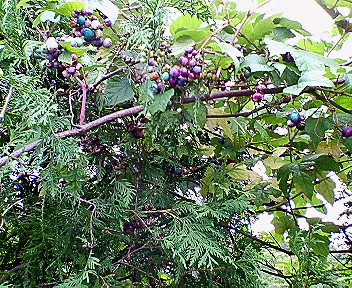 蒸し茄子が好きで夏からこのかた蒸し茄子、トマトサラダ、きゅうりの浅漬けをシャッフルして食膳に載せていた。 どれも作り方は簡単な上に食べて美味しいので作り甲斐もあって楽しい。 とりわけ楽しいのが蒸し茄子で茄子を縦切りにして水にさらし、金属のザルにとってから蒸し器で蒸す。 (この手順で、チンすれば、といわれるが我が家には電子レンジというものは存在しない ついでをいえば電気釜というものも存在しない 理由は使うのが苦手だから、と別に厳然としたポリシ−があるわけでもなんでもない あやいやだ 話が逸れたわ) 蒸しあがった茄子を熱いまま竹串か割り箸で裂く。 この蒸し釜から上げた時の蒸し水に茄子の色が落ちて、「まあ」と言って思わず料理の手を止めてしまうほど美しい。 かすかに緑色を帯びた透明な淡いセルリアンブルー。 しかもまた蒸した茄子を手に取った時、指に移る茄子の青みがかった紫色のきれいなこと。 染まった指先にしばしこれまた手が止まる。 手を止めていては仕事にならないので花染めのように染まった色を惜しみつつ味をつけたおだしに裂いた蒸し茄子を浸し、すったしょうがをてっぺんに乗っけて完成、である。 色美しく、美味しい秋の食材の話。 写真は近くのお寺さんの裏手の木に蔓をからませた野ぶどうの実 瑠璃色、というんでしょうかまたこれも美しい色です。 「庫裏にしも 七宝あれり 野の実り」 猫狗 |