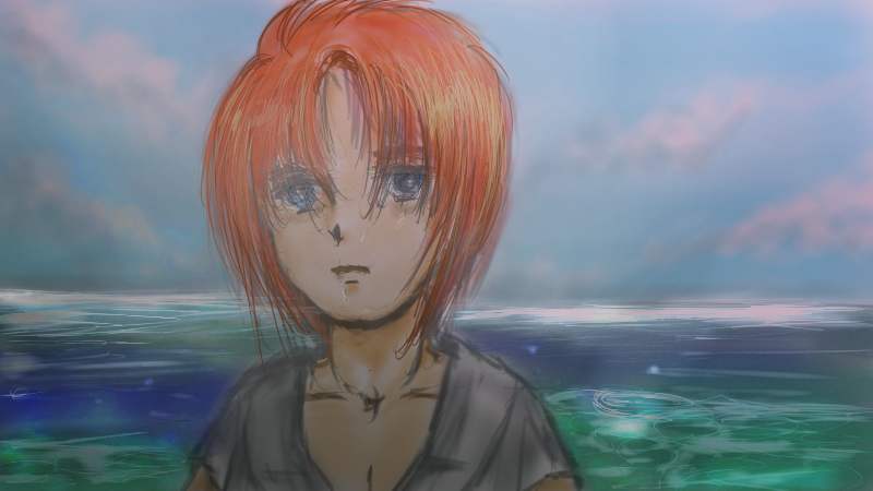 舞台は沖縄でしたよね。背景は南国の明るく美しい海と空ですが、それも霞がかかったようにぼやけて、紅の心情をよく表わしているように思えます。 (空の色、雲の形が特に好きです。) この絵全体をぼかす効果はどうやるのでしょうか。